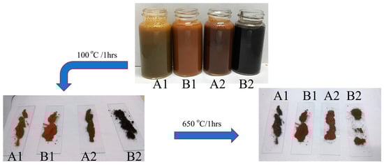 Figure 6 demonstrates the appearance changes of samples in their original state, after drying at 100 °C, and after calcination at 650 °C. In the original solution state, the four sample groups exhibited distinct color characteristics: A1 appeared light yellowish-brown, B1 showed brown, A2 displayed dark brown, and B2 presented a distinctive black color. These color variations likely reflect differences in oxidation states of ferrite treatment and the degree of interaction with PVA molecules under different processing conditions. Samples with H2O2 pretreatment (B1 and B2) showed notably darker colors, suggesting that pre-oxidation might promote ferrite oxidation and complex formation. After drying at 100 °C, all samples transformed into powdery substances while maintaining similar color characteristics, indicating that low-temperature drying primarily removed water content without significantly altering their chemical composition. Notably, at this stage, samples A1 and B1 exhibited weak magnetic properties, while A2 and B2 showed stronger magnetic responses, potentially due to the influence of different ferrite treatment strategies on magnetic oxide formation. Upon calcination at 650 °C, significant color changes occurred. Samples A1, B1, and A2 transformed to deep brownish-red, characteristic of the α-Fe2O3 phase, while maintaining good magnetic properties. However, sample B2 not only became lighter in color but also completely lost its magnetic properties after high-temperature calcination. This phenomenon suggests different phase transformation processes of iron oxides under high temperatures depending on the treatment conditions. These observations reveal the critical influence of H2O2 pretreatment and stepwise ferrite addition strategies on the final product properties.
