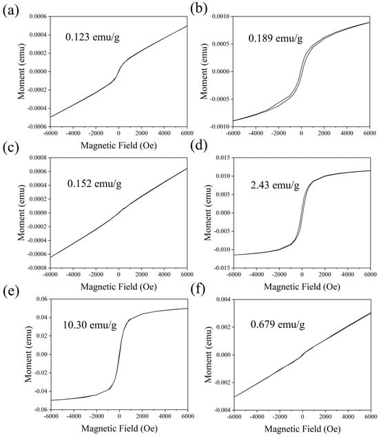 A detailed magnetic characterization was conducted to understand the influence of PVA on the magnetic evolution of ferrite precipitates. Figure 7 shows magnetic hysteresis loops of samples under different thermal treatment temperatures. Ferrite samples prepared without PVA exhibited relatively weak magnetism, with saturation magnetization of only 0.123 emu/g after drying at 100 °C (Figure 7a), slightly increasing to 0.189 emu/g after calcination at 650 °C (Figure 7b), indicating the difficulty in forming strong magnetic phases under mild conditions through simple ferrite formation. With PVA introduction, sample B1 showed saturation magnetization of 0.152 emu/g after drying at 100 °C (Figure 7c), comparable to PVA-free samples. However, its magnetic properties were significantly enhanced after calcination at 650 °C, with saturation magnetization increasing to 2.43 emu/g (Figure 7d). This substantial magnetic enhancement suggests PVA’s influence on magnetic phase formation at high temperatures, with hysteresis loop shape changes indicating magnetic structure reorganization. Sample B2 demonstrated the most distinctive magnetic evolution characteristics. After drying at 100 °C, its saturation magnetization reached a remarkable 10.30 emu/g (Figure 7e), substantially higher than other samples. However, after calcination at 650 °C, its magnetism dramatically decreased to 0.679 emu/g (Figure 7f). This anomalous magnetic deterioration likely results from phase transitions at high temperatures, suggesting the formation of a unique metastable magnetic phase in the initial B2 sample []. The magnetic properties achieved in our study significantly surpass those reported in similar research. Ghanbari et al. [] reported a maximum saturation magnetization of 5.2 emu/g for PVA-coated Fe3O4 nanoparticles, whereas our B2 sample exhibited 10.30 emu/g at 100 °C. This enhanced magnetic performance likely results from our H2O2 pre-oxidation method, which alters the interaction between PVA and iron ions. Similarly, Saleem et al. [] employed different coating strategies for ferrite nanoparticles but achieved lower magnetic performance. The unique metastable magnetic phase formed in our B2 sample demonstrates the potential for tailoring magnetic properties through controlled processing conditions.