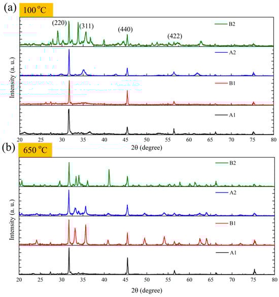 Figure 8 presents XRD patterns of samples under different treatment conditions after thermal processing at 100 °C and 650 °C. All samples exhibited characteristic diffraction peaks of Fe3O4, including (220), (311), (440), and (422) crystal planes. However, significant differences in crystallinity and phase composition were observed under different treatment conditions. After 100 °C thermal treatment (Figure 8a), sample B2 demonstrated the most complete Fe3O4 characteristic peaks, with clearly visible and intense diffraction peaks at 2θ = 30.1° (220), 35.5° (311), and 62.6° (440), corresponding to its excellent magnetic performance (10.30 emu/g). In contrast, samples A1 and B1 showed relatively weak peak intensities despite displaying Fe3O4 characteristic peaks, explaining their lower magnetization values (0.123 and 0.152 emu/g, respectively). Upon heating to 650 °C (Figure 8b), significant structural changes occurred. Fe3O4 characteristic peaks became more distinct in samples A1 and B1, with B1 showing notably increased magnetization to 2.43 emu/g, consistent with its enhanced crystallinity. However, although sample B2 maintained good crystallinity after high-temperature treatment, its magnetization dramatically decreased to 0.679 emu/g. This anomalous phenomenon might result from partial transformation of Fe3O4 to α-Fe2O3 at high temperatures, evidenced by the emergence of a new diffraction peak at 33.2°. These findings reveal the complex influence of preparation conditions and thermal treatment temperatures on the final product’s structure and magnetic properties.