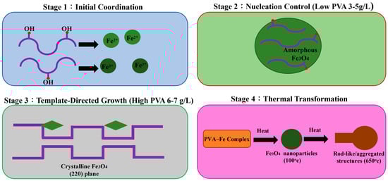 The interaction between PVA and iron oxides can be described by a multistage coordination–templating mechanism, as shown in Figure 10, that explains both the observed FTIR spectral changes and the XRD crystallinity patterns. In the initial coordination stage, PVA hydroxyl groups (–OH) act as electron donors that coordinate with Fe2⁺ and Fe3⁺ ions through their oxygen atoms [,,]. This coordination is evidenced by the observed changes in the O–H stretching vibration peak (2750–3000 cm−1) in our FTIR results, which became more pronounced at lower PVA concentrations (3–4 g/L). At lower PVA concentrations (3–5 g/L), a nucleation control mechanism dominates, where polymer chains adsorb onto the surface of forming iron oxide nuclei. The hydroxyl groups of PVA form hydrogen bonds with the surface hydroxyl groups of iron oxide nuclei, creating a steric barrier that inhibits crystal growth and leads to the amorphous characteristics observed in XRD patterns. This explains the broadened diffraction peak around 35° seen in our samples. Conversely, at higher PVA concentrations (6–7 g/L), a template-directed growth process occurs. PVA molecules form ordered structures due to intermolecular hydrogen bonding, creating templates that guide the growth of specific crystal planes. This explains the emergence of preferential growth along certain crystallographic directions, as evidenced by the sharp diffraction peak at 31.72° (corresponding to the (220) crystal plane of Fe3O4) in our XRD analysis. The thermal transformation pathway further supports this mechanism. Upon heating, the PVA template undergoes thermal decomposition, which explains the morphological evolution observed in TEM from dispersed nanoparticles within fibrous networks at 100 °C to rod-like structures and aggregated particles at 650 °C. This transformation follows the sequence: PVA–Fe complex → PVA-stabilized Fe3O4 nanoparticles → thermally reorganized Fe3O4/α-Fe2O3 structures. This proposed mechanism aligns with our experimental observations while providing a theoretical framework that connects the molecular interactions to the observed macroscopic properties of the magnetic precipitates.