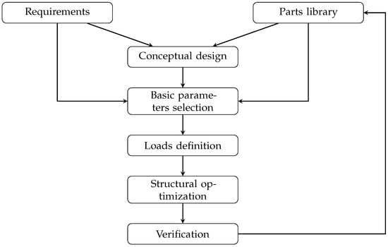 Design in a systems approach can be presented in the form of the so-called V-model of the product life cycle []. The V-model is an illustration of the product life cycle consisting of two branches in which the processes are arranged in the shape of the letter V. The left part lists the processes related to the design process, such as requirements definition, feasibility study, top-level system design, subsystems and components, and production and integration. In the right branch of the model, for each process of the left branch, there are corresponding processes verifying the compliance of the results with the requirements.