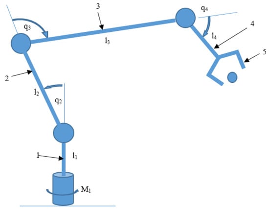 The structure of the manipulator is shown in Figure 2. It consists of the following elements: element 1, the drive moving the manipulator in vertical axis 1; element 2 driven by a joint with axis 2 perpendicular to the axis of element 1; elements 3 and 4 with drives on axes parallel to axis 2; and element 5, a gripper that can rotate around its longitudinal axis, perpendicular to drive axis 4. During the analysis, the structure of the manipulator is simplified by locking the rotation in axis 1 so all the elements move in a common plane. The structure will be considered as a flat mechanism, which is sufficient for performing load analysis.