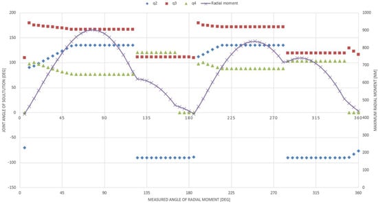 Figure 3 shows the values of the maximum radial moments loading the manipulator joint, which is marked with a continuous line, and the corresponding values of the internal coordinates of the manipulator, which are marked with points. The angle at which the maximum values of moments are tested is marked on the X axis. Figure 4 shows the obtained maximum values of radial moments for both directions of the moment acting in joint 1. The black points indicate the maximum value of the moment that is taken into account in the further part of the calculations. The points are placed for the angle changing every 22.5 degrees.