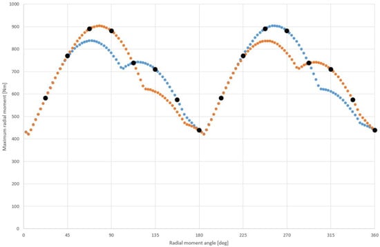 Maximum values of the radial moment in joint 3 of the manipulator depending on the considered direction (orange for positive direction, blue for negative direction). Black points indicate the maximum moment values that were used for further calculations.