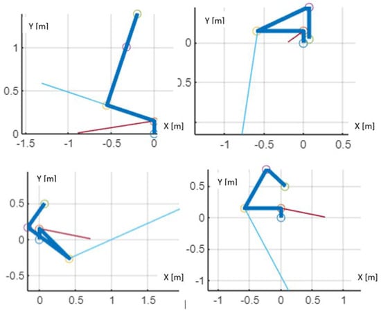 Selected configurations for which the radial moments in joint 3 are the highest (markings: thick blue lines—manipulator links, wheels—manipulator joints, thin blue line—torque vector in joint 3, thin red line—torque vector in joint 2).