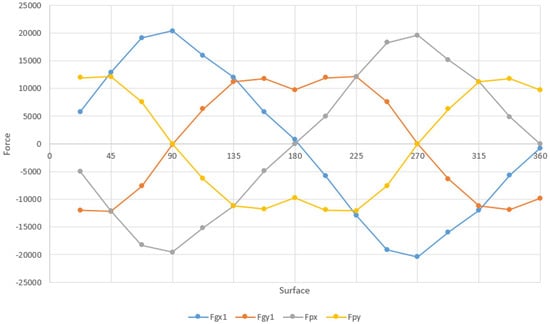 Load cases resulting from variable directions of radial moment loads. The table shows the forces (named Fg1 and Fp) that act on the body surfaces through the joint bearing in the X and Y directions.
