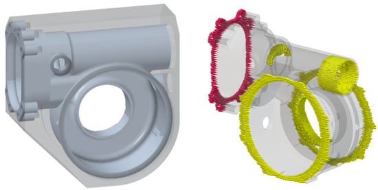 The project space is constructed so that its volume is as small as possible but does not limit the operation of the optimization algorithm. This space is also appropriately cut out to provide space in the resulting component for gear components, cables, and electronic systems. The passive space is constructed from thin-walled primitives. This space defines the interfaces for attaching the joint components, to which constraints and loads will also be applied. The passive space is built in such a way as to ensure tightness in the resulting structure and to guarantee the possibility of running cables between individual compartments of the body. The passive space is functionally a fully fledged model of the gear body, but it does not take into account the strength requirements. Topological optimization aims to modify the body so that it also meets the strength conditions. It should be noted that the passive space and design space models are related to a given transmission and, in accordance with the adopted methodology, are defined at the part library level. The boundary conditions are shown in the passive space (Figure 7). The part is fixed on its left surface (red marks) and the loads are applied on the surfaces which are interfaces to bearings and other components (yellow marks). The figure shows one of the load cases where the maximum radial moment is at an angle of 90∘.