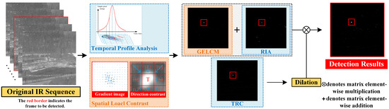 This study designs and integrates the GELCM (spatial detection) with TRC and RIA (temporal detection) into the Spatial–Temporal Fusion Detection method. The GELCM, TRC, and RIA complement each other, and their synergy in STFD enables effective target detection across diverse scenarios. The method demonstrates its effectiveness and robustness through evaluations in various scenarios and infrared sequence types.
