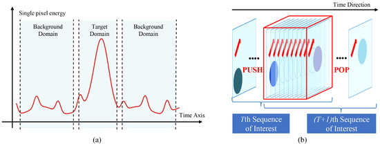 This study divides the temporal sequence into two regions: the Domain of Target (DT) and the Domain of Background (DB). A target’s presence within the observed period is characterized by a distinct peak in the temporal profile, enabling its detection at the pixel level.