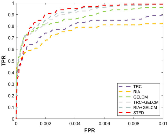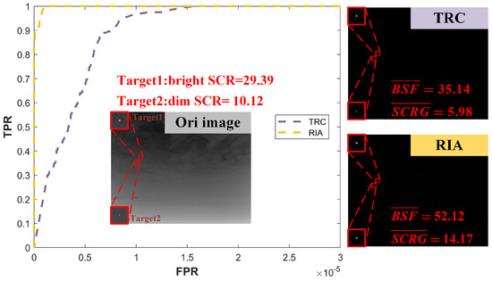 Comparison test of TRC and RIA in a simple background dim target scenario. As demonstrated in the figure under clean background conditions with low−contrast targets, the RIA method demonstrates superior detection capability over TRC across all evaluation metrics, including ROC curves, Background Suppression Factor (BSF), and Signal-to-Clutter Ratio Gain (SCRG).