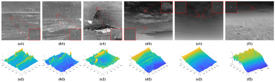 Visual and 3D surface analysis across sequences. (a1–f1) Infrared images from Seq.1 to Seq.6, with targets highlighted in red boxes and magnified in the image corners. (a2–f2) Corresponding 3D surface mesh diagrams for each sequence. Targets in the figure are annotated with red bounding boxes and magnified.