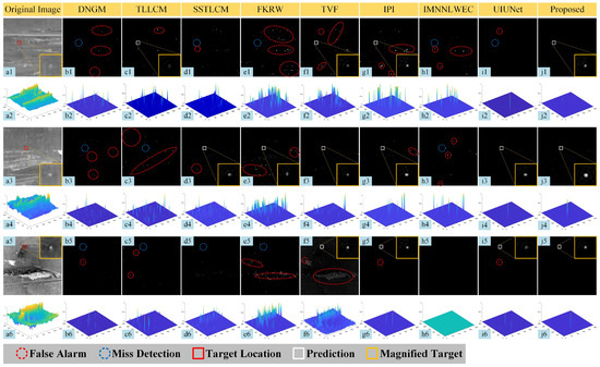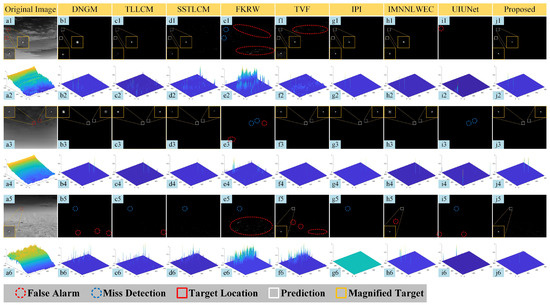 Detectionresults and corresponding 3D visualizations for Seq.4 to Seq.6 using different algorithms. The red rectangle indicates the target location, with an enlarged view in the corner. A missing rectangle indicates a missed target in the frame. Rows 1, 3, and 5 (a1–j1, a3–j3, a5–j5) correspond to detection results for Seq.4, Seq.5, and Seq.6, respectively, while rows 2, 4, and 6 (a2–j2, a4–j4, a6–j6) show the 3D mesh visualizations for Seq.4, Seq.5, and Seq.6.