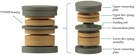 Laminated disc springs have garnered widespread attention from researchers due to their simple structure, controllable stiffness, and strong energy-dissipation capacity through friction, leading to their application in vertical seismic isolation devices for building structures [,,]. Li et al. [] combined lead-core rubber bearings with disc springs to create a three-dimensional multi-functional seismic isolation bearing installed at building foundations. They investigated the isolation effectiveness through a time–history analysis. Wang et al. [] conducted theoretical and experimental analyses to study the mechanical properties of composite disc spring vibration isolators (CDSVIs). Zhao et al. [] performed shaking table tests using different seismic waves on 1:2 scale fixed-base models and DSB vertical seismic isolation models, demonstrating that disc spring bearings can effectively reduce the impact of vertical seismic forces on superstructures. Currently, three-dimensional isolation systems combining disc springs with rubber have been proven as an effective three-dimensional seismic isolation method [,], being applied in structures, such as bridges and nuclear power plants []. However, traditional disc spring isolation bearings face challenges in simultaneously meeting the requirements of seismic isolation performance under minor earthquakes and controlling mechanical responses and deformations during major earthquakes due to their constant stiffness characteristics.