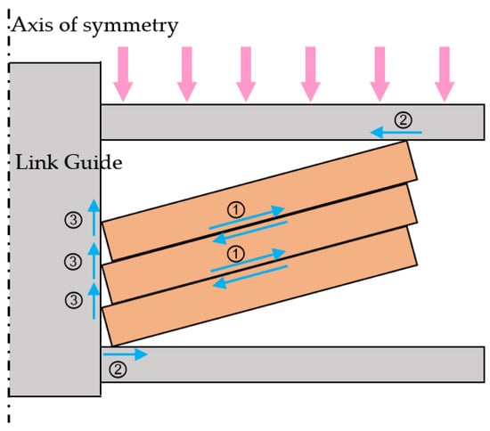 The VVSDSI bearing adjusts its stiffness, load-bearing capacity, and deformation ability by serially connecting upper and lower disc spring groups with varying stacking layers. As shown in Figure 3, under applied loads, the damping force of the bearing is primarily composed of Coulomb damping, which originates from three main sources: (1) friction between adjacent disc springs; (2) friction between the end disc springs, and the connecting plates; and (3) friction between the disc springs and the guide rod. The Coulomb damping force is primarily influenced by the configuration of the disc springs and the number of stacked plates in each set, as well as the surface quality and lubrication conditions of the disc springs.