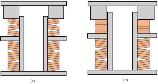 The stiffness of the VVSDSI bearing varies with the actual deformation, allowing its working state to be classified into two stages: the isolation stage and the protection stage, as illustrated in Figure 4. The deformation of the disc springs differs between these stages. In the isolation stage (Figure 4a), the bearing undergoes relatively small deformations. At this stage, the upper and lower disc spring groups work in unison, providing relatively low vertical stiffness, which enhances vibration isolation effectiveness. As deformation increases, the upper disc spring group reaches its compression limit. Subsequently, the lower disc spring group deforms, transitioning the structure into the protection stage (Figure 4b). In this state, the vertical stiffness of the bearing increases significantly, enabling an adaptive adjustment of vertical stiffness to enhance structural protection.