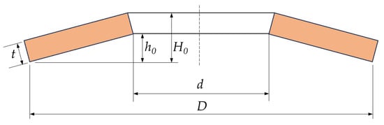 where E and μ represent the elastic modulus and Poisson’s ratio of the disc spring material, respectively; D and t denote the outer diameter and thickness, respectively; h0 denotes the compressible stroke of the disc spring, as illustrated in Figure 5. M1 is given by the following: