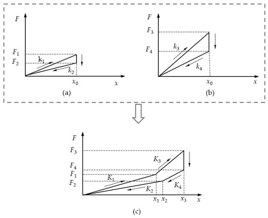 where k1 and k3 are the loading stiffness of the upper disc spring group and the lower disc spring group, and k2 and k4 are their unloading stiffness, which can be calculated by Equations (1)–(4).