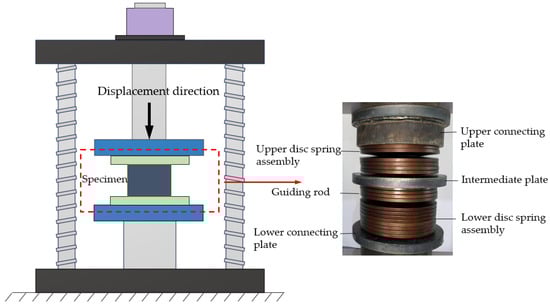 To study the working performance of the VVSDSI bearing and verify the accuracy of the theoretical hysteresis model, a vertical loading test was carried out on the proposed variable stiffness bearing. The structure of the VVSDSI bearing is shown in Figure 7, which mainly consists of upper and lower disc spring assemblies, guide rods, upper and lower connecting plates, and an intermediate plate. The upper disc spring assembly consists of six disc springs, and the lower disc spring consists of twelve disc springs. This study utilizes the dimensions of the B-series disc springs as specified in the Chinese Disc Spring Specification [], with detailed design parameters presented in Table 2.