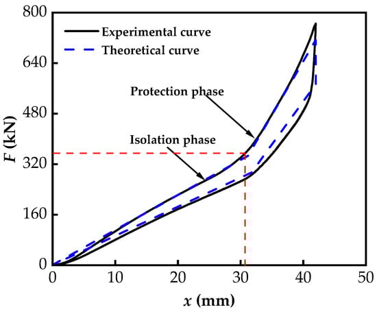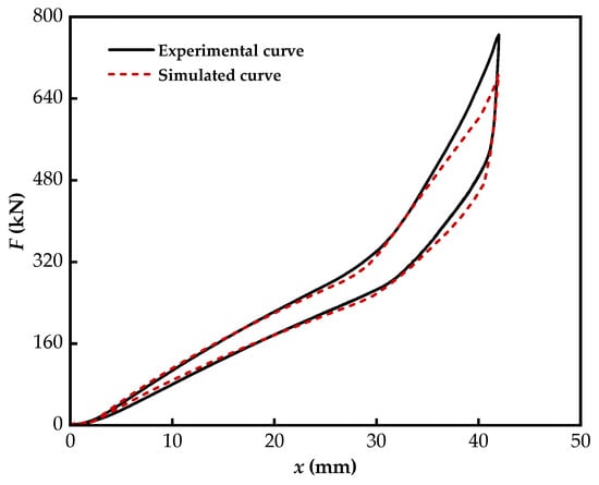 Figure 15 shows the comparison between experimental results and numerical simulation results of the load-displacement curves for VVSDSI bearings under ultimate loading conditions. As can be seen from the figure, the simulated values of VVSDSI bearings exhibit similar overall curve characteristics to the experimental values in terms of the shape. During the seismic isolation phase, the force–displacement curves of the bearings show good agreement between simulation and experimental results. However, after entering the protection phase, the deviation between simulation results and experimental values increases, with the peak load error reaching 10.07%. Although local discrepancies exist, the overall comparative results demonstrate that the numerical model can effectively predict the mechanical behavior of the bearings.
