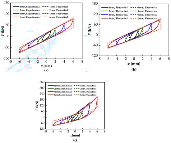 Table 4 presents the experimental and theoretical analysis results of hysteresis curves under different preloading displacements and loading amplitudes. The data in Table 4 show that the maximum errors of Fmax and Fmin are 7.13% and 3.45%, respectively, with average errors of 2.20% and 1.23%. The average error for equivalent stiffness values reaches 6.53%. It is worth noting that when the preloading displacement is 30 mm and the loading amplitudes are 1 mm and 2 mm, the equivalent stiffness error is relatively large. This phenomenon occurs because, at this stage, the upper disc spring group is approaching its limit state, leading to an increase in the nonlinearity of the disc springs, which in turn results in greater discrepancies. In summary, the experimental results align well with the theoretical solutions, indicating that the proposed variable-stiffness seismic isolation bearing (VVSDSI) hysteresis model can effectively predict the hysteretic behavior of the bearing.