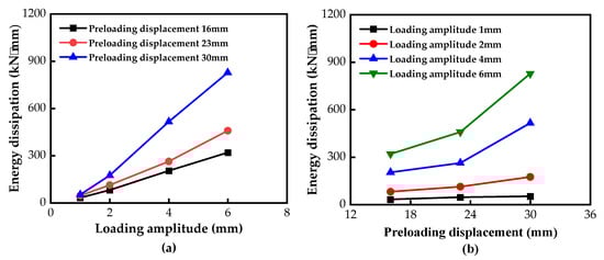 The energy dissipation capacity of the bearing is evaluated by calculating the enclosed area of the hysteresis loop, as shown in Figure 10. Figure 10a illustrates that, at a constant preloading displacement, the energy dissipation of the bearing increases with the loading amplitude. Specifically, when the preloading displacement is 23 mm, the energy dissipation rises from 45.68 kN·mm to 458.38 kN·mm as the loading amplitude increases. Furthermore, a comparison of the slope of the curves under different preloading displacements reveals that at 16 mm, the slope is 57.48 kN·mm/mm, whereas at 23 mm, it increases to 82.54 kN·mm/mm. This indicates that as the loading amplitude increases, the influence of preloading displacement on energy dissipation becomes more pronounced. As shown in Figure 10b, at a loading amplitude of 2 mm, the energy dissipation values are 80.95 kN·mm, 112.67 kN·mm, and 174.22 kN·mm for different preloading displacements. When the loading amplitude increases to 4 mm, the corresponding energy dissipation values rise to 203.64 kN·mm, 262.88 kN·mm, and 515.68 kN·mm. These results demonstrate a positive correlation between the preloading displacement and energy dissipation capacity at a given loading amplitude.