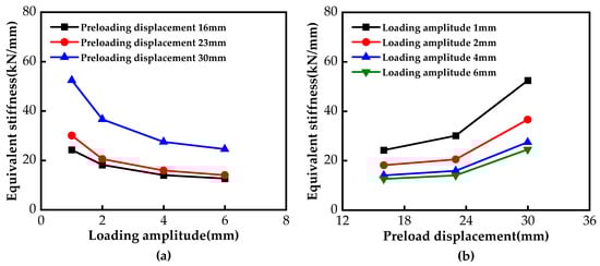 Equivalent stiffnesses of the VVSDSI bearing under different preloading displacements and loading amplitudes. (a) Different preloading displacements; (b) different loading amplitudes.