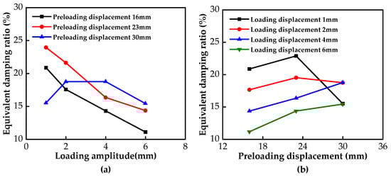 Equivalent damping ratios of the VVSDSI bearing under different preloading displacements and loading amplitudes. (a) Different preloading displacements; (b) different loading amplitudes.