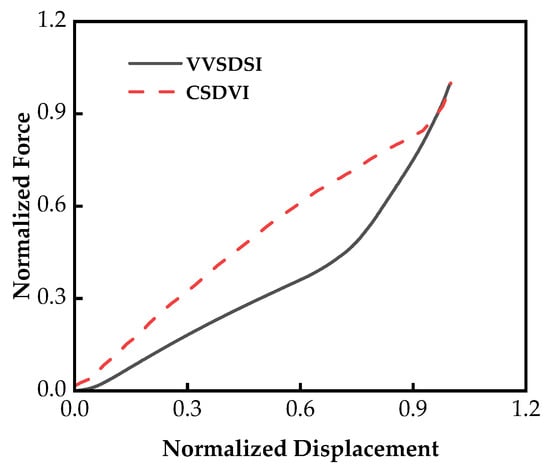 In order to further study the mechanical properties of the VVSDSI bearing, this paper compares the working performance of the proposed seismic isolation bearing (VVSDSI) and the conventional disc spring seismic isolation bearing (CSDVI) [] during loading. By normalizing the force–displacement curve, the performance difference between the two bearings can be analyzed more intuitively.