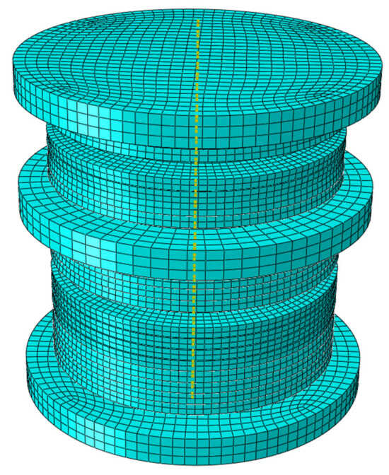 This section conducts a numerical simulation analysis on the VVSDSI bearing using ABAQUS finite element software. The disc spring material is 60Si2Mn with an elastic modulus E = 2.06 × 105 MPa and Poisson’s ratio μ = 0.3. During the modeling process, the disc spring is simulated using an 8-node incompatible mode hexahedral element (C3D8I). The influence of guide rods is neglected, while the upper connecting plate, middle steel plate, and lower connecting plate are all modeled as rigid materials. The finite element model of the VVSDSI bearing is shown in Figure 14.