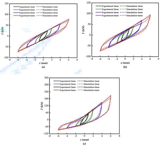 Comparison of experiment and simulation values of load-displacement hysteresis curves under cyclic loading. (a) Preloading displacement 16 mm; (b) preloading displacement 23 mm; (c) preloading displacement 30 mm.