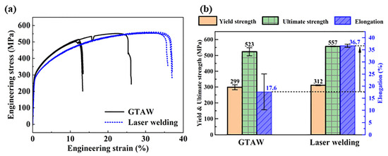 - Elongations of the samples welded by GTAW and laser welding were 17.6% and 36.7%, respectively. The increase in the elongation in laser welding was due to the combined effect of full welds without visible defects and a homogeneous elemental distribution in the HAZs, which resulted in fractures occurring in the 316L stainless-steel base material.