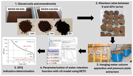 Flow chart of the steps for soil physical quality (SPQ) parameters determination: 1. preparation of sieved soils (Ginosa, GIN, and Castellaneta, CAS), and amendments, i.e., compost (COM), vermicompost (VER), and biochar (BIO); 2. soil/amendment mixture in cylindrical samplers; 3. soil water retention determination; 4. parameterization of soil water retention function; 5. determination of the SPQ parameters.