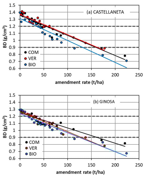 Dry soil bulk density, BD, against the amendment rate for the three tested amendments (COM = compost; VER = vermicompost; BIO = biochar) at (a) the Castellaneta and (b) the Ginosa field sites. For a given site, the continuous lines are the significant linear regression lines (black for COM; red for VER; blue for BIO). The dashed grey lines define the range of values inside which the soil physical quality is considered good.