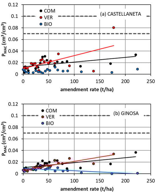 Macroporosity, PMAC, against the amendment rate for the three tested amendments (COM = compost; VER = vermicompost; BIO = biochar) at (a) the Castellaneta and (b) the Ginosa field sites. For a given site, the continuous lines are the significant linear regression lines (black for COM; red for VER; blue for BIO). The dashed grey lines define the range of values inside which the soil physical quality is considered good.