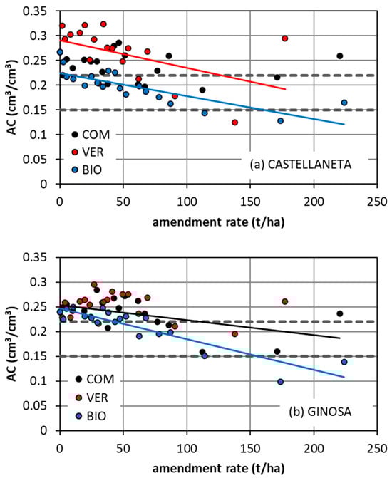 In the range of the ar values considered for the experiment, using the VER at CAS and the COM at GIN allowed us only to define an armin value, that is the amount of the amendment inducing a decrease of the AC from a too high value to AC = 0.22 cm3/cm3. These armin values were equal to 118 t/ha for the VER at CAS and 111 t/ha for the COM at GIN. It was not possible to define an armax value beyond which the AC became too low (<0.15 cm3/cm3). Instead, both the armin and the armax were defined for the BIO, and they were equal to 9 t/ha and 150 t/ha, respectively, at CAS, and to 45 t/ha and 162 t/ha, respectively, at GIN. The minimum amendment rate was five times lower at the CAS than at the GIN soil even if, in the absence of an amendment, the former soil was more aerated than the latter. The maximum amendment rate was similar for the two soils.