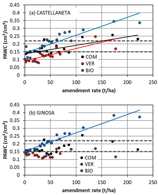 Plant available water capacity, PAWC, against the amendment rate for the three tested amendments (COM = compost; VER = vermicompost; BIO = biochar) at (a) the Castellaneta and (b) the Ginosa field sites. For a given site, the continuous lines are the significant linear regression lines (black for COM; red for VER; blue for BIO). The dashed grey lines define the range of values inside which the soil physical quality is considered good.
