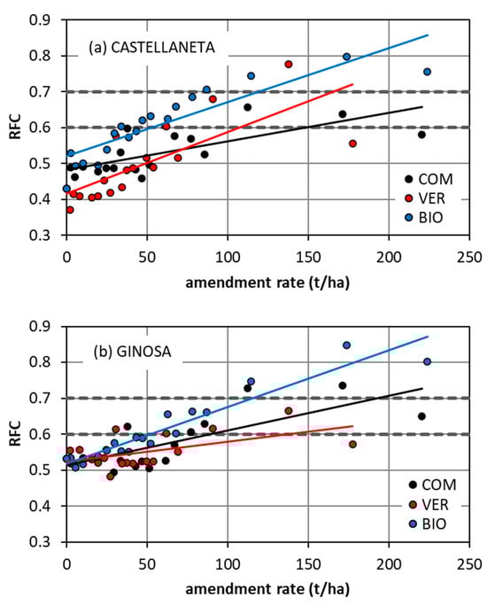 Adding the amendment determined an increase of the RFC in all considered cases (Figure 6) but the RFC vs. the ar relationship was stronger with the BIO (R2 = 0.79–0.91) than with the COM and the VER (R2 = 0.33–0.59) (Table 1).