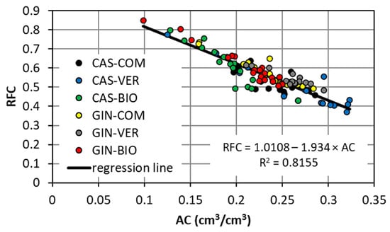 Relationship between the relative field capacity, RFC, and the air capacity, AC, for the three tested amendments (COM = compost; VER = vermicompost; BIO = biochar) at Castellaneta (CAS) and Ginosa (GIN) and fitted regression line to the whole dataset.
