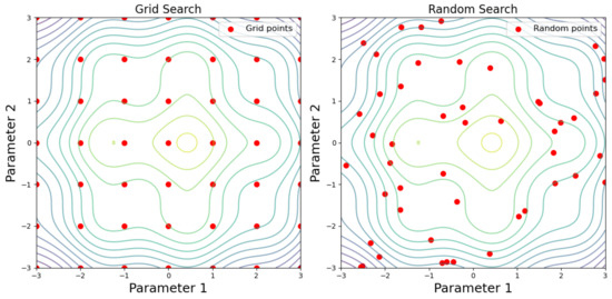 Unlike GS, Randomized Search, also called Random Search (RS), performs random selection by evaluating all given hyper-parameters instead of testing them one by one in sequences [26,27]. This method can also be easily applied to optimize machine learning-based models. RS is more efficient than GS but has less of the computational processing resources required for large search spaces [28]. Figure 1 below shows the difference between Grid Search and Random Search in terms of optimizing the models.