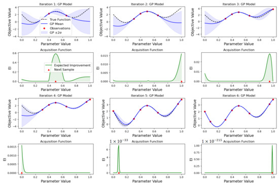 Figure 2 below visualizes how Bayesian Optimization works through two main components: a surrogate model and an acquisition function.