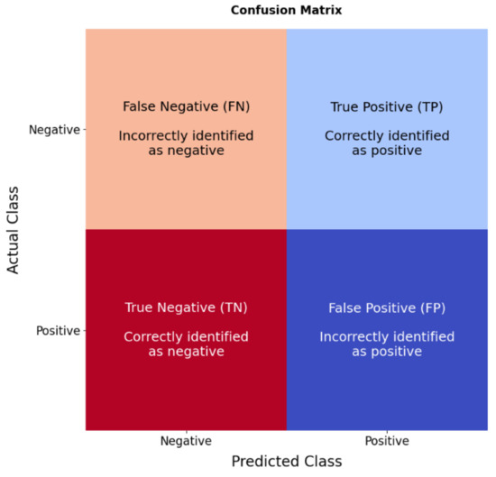 Evaluation of our models was carried out using classification metrics to calculate the accuracy, sensitivity, and AUC score of each model. Shown as a confusion matrix (Figure 4), classification metrics contain binary values of four prediction categories: true positives (TPs), false positives (FPs), true negatives (TNs), and false negatives (FNs) [37].