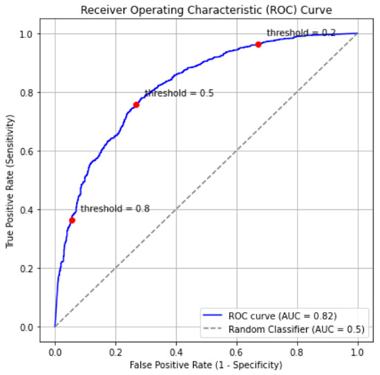 Moreover, we calculated the area under the curve (AUC), which represents the area under the Receiver Operating Characteristic (ROC) curve. This parameter is a performance metric for binary classification problems that plots the True Positive Rate (sensitivity) and the False Positive Rate (Specificity) at various threshold settings [39]. The AUC score ranges between 0 and 1.0, with an AUC of 0.5 suggesting no discrimination ability, meaning that the model’s performance is equivalent to random guessing and has no ability to discriminate between the positive and negative classes [40]. Figure 5 is an example of an AUC graph and its score.