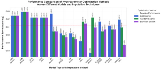 Figure 6 is a comparison of the accuracy of our models, with the optimization method color-coded: Grid Search (blue), Random Search (green), and Bayesian search (purple). The baseline value is shown as a dashed line at approximately 0.611. Based on our experimental study, we found that the SVM model outperformed the other models, except for the pre-processing approach. The MICE imputation method with SVM yielded the highest accuracy, 0.6294, showing marginal effectiveness over the other imputation techniques. In contrast, RF, which underperformed the others, only displayed good performance when using mean imputation and Grid Search to determine the ideal configuration of its hyper-parameter, which ranged from 0.595 to 0.609. Unlike SVM and RF, the XGBoost models achieved varying levels of accuracy based on the imputation technique, between 0.577 and 0.619.