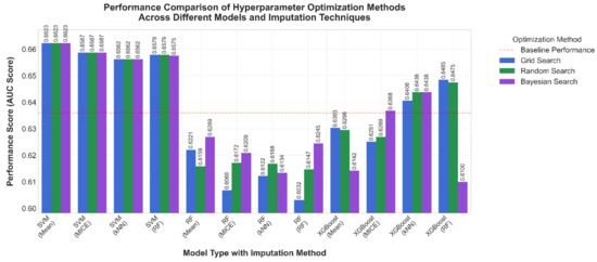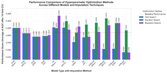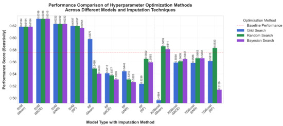 In general, the findings of this study suggest that even though model choice is essential, the selection of an appropriate hyper-parameter optimization method and imputation technique can have significant impacts on model performance. The results also emphasize the importance of cross-validation to obtain reliable performance estimates: baseline performance metrics alone may not provide a complete picture of model generalization capability. Additionally, Bayesian Search consistently required less processing time compared to Grid and Random Search in terms of computational efficiency, with average processing times of 7, 5.3, and 4.8 min, respectively, for SVM, RF, and XGBoost. The software and hardware that were used to conduct these experimental studies have limits to their processing ability. Thus, processing times would differ with other devices.