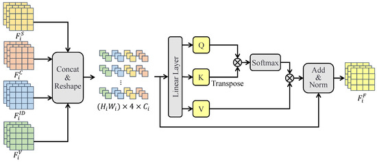 Initially, the features , , , and are concatenated and reshaped into a tensor with dimensions , denoted as . This reshaping aligns the data with the input requirements of the self-attention mechanism.