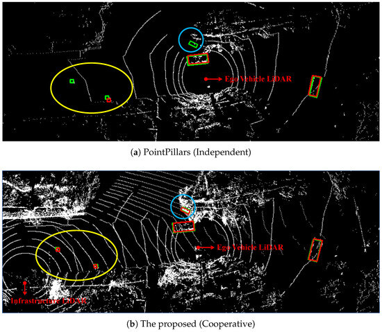 Figure 6b, the proposed method successfully detects these objects by leveraging complementary information from infrastructure LiDAR. This demonstrates that in a vehicle–infrastructure cooperation system, infrastructure sensors enhance single-vehicle perception capabilities by providing complementary viewpoint data, effectively mitigating blind spots caused by occlusion and reducing performance degradation typically observed in single-vehicle perception at extended distances.