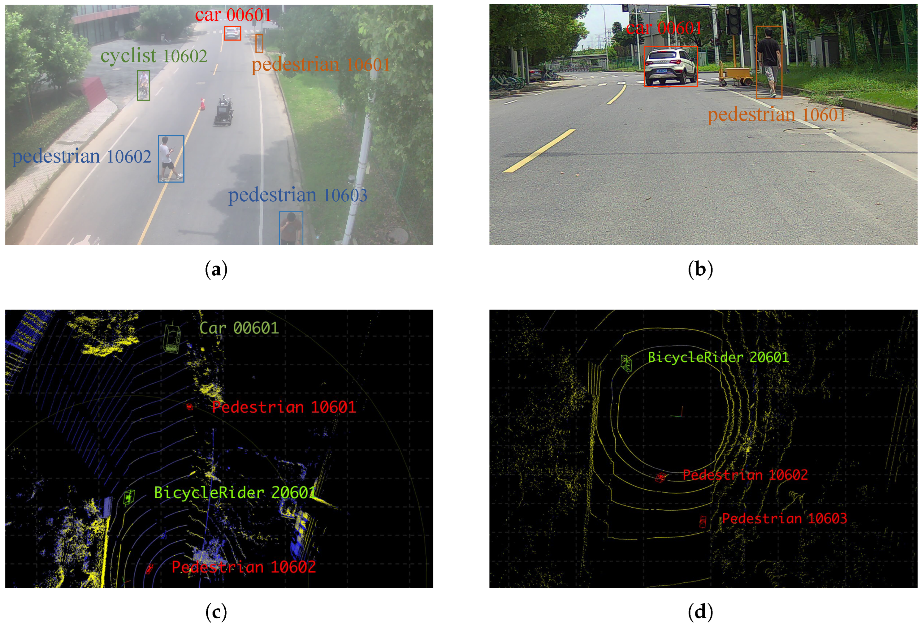 18], is insufficient for verifying the generalization of algorithms. Moreover, existing vehicle–infrastructure perception datasets typically only contain annotations for vehicles, lacking other important categories like pedestrians and cyclists, which restricts comprehensive studies of traffic scenarios.