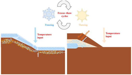 Seasonally frozen soils undergo repeated freezing and thawing processes due to cyclical climate change, and their water temperature coupling characteristics have a profound impact on soil structure and stability (see Figure 1). During the freezing stage, the lowering of air temperature leads to the formation of a frozen layer in the surface layer of the slope, and the transfer of heat to the deeper layers creates a significant temperature gradient, driving water to migrate to the freezing front and gather, forming a large number of ice crystals. The volume expansion of the ice crystals causes the frozen layer of soil to undergo frost deformation, resulting in the uplift of the surface layer of the slope, while the lower layer of soil suffers from localized water loss due to the migration of water, reducing the compactness of the soil and significantly weakening its mechanical properties. In the melting stage, as the temperature rises, the frozen layer gradually melts, and the ice crystals are transformed into liquid water and infiltrate along the slope structure to the foot of the left corner, increasing the saturation and looseness of the soil in the region. This process further weakens the strength of the soil at the toe of the slope and increases the risk of settlement and landslide. The mechanism of freezing water loss and thawing saturation in the freeze–thaw cycle of seasonally frozen soil not only exacerbates the structural disturbance caused by the soil water–heat migration and phase change effects, but also significantly increases the possibility of landslides and geohazards.