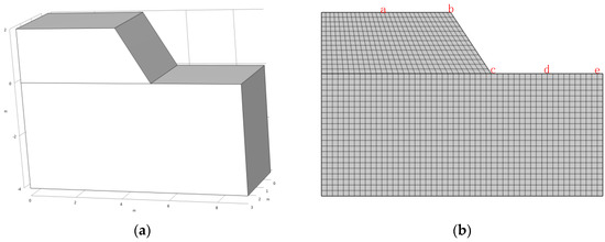 Permafrost slope modeling. (a) Model (3D); (b) meshing (2D). (In (b), a is Top center of slope, b is Slope top, c is Bottom of slope, d is Bottom center of slope, e is Right end of slope bottom).