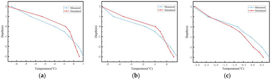 Figure 3 shows the comparison results of the measured and simulated values of temperature changes with depth during January, February, and March [16]. From the overall trend, the change laws of the measured curves and the simulated curves in different months are consistent, all showing that the temperature tends to be stable as the depth increases. This indicates that the model has high accuracy in capturing the law of soil liquid temperature changes with depth, especially under the winter conditions of January and February, where the simulation results match well with the measured data, verifying the adaptability of the model to the heat transfer process in low-temperature environments. However, in March, the simulated values of the shallow layer (regional surface layer humidity changes) are slightly lower than the measured values. This may be related to the rapid surface temperature rise and the characteristics of cover materials (such as snow melting and surface layer humidity changes) not being fully considered. Neglecting the snowmelt process may lead to inaccuracies in the thermal boundary conditions of the surface layer of frozen soil, causing the model to overestimate the stability of the frozen soil. In reality, when the snow cover melts, the ground surface turns into bare soil with a low albedo, enhancing its heat absorption capacity, which results in the simulated temperature being lower than the measured temperature. Furthermore, failing to consider the regulatory effects of precipitation, surface runoff, and snowmelt water on the distribution of surface humidity can lead to the accumulation of water at the freeze–thaw interface, forming ice lenses. These ice lenses release latent heat, slowing down the cooling of the frozen layer. This situation may cause an underestimation of the temperature of the frozen soil, making the simulated values lower than the measured ones. This discrepancy echoes findings by Fu Q et al. [12], who emphasized the insulating role of snow cover in delaying thawing processes. Compared to Zhou J’s [22] phase-lag model, our framework better resolves latent heat release during ice–water transitions, particularly in shallow layers, where pore water phase changes dominate thermal responses. Overall, the model can accurately simulate the winter soil liquid temperature distribution, but there are limitations in representing the dynamic thermal process of the surface layer in spring. Further improvements are needed to enhance the model’s ability to describe the hydrothermal coupling mechanism under complex climate changes.